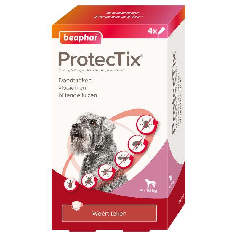 Beaphar ProtecTix® hond 10-25kg is een snelwerkende spot-on tegen teken, vlooien, bijtende luizen, zandvliegen, muggen en stalvliegen. Bij gebruik van de pipetten wordt het risico dat parasieten bijten en ziektes zoals Leishmaniose en Ehrlichiose overbrengen verminderd. De combinatie van de werkzame stoffen imidacloprid en permethrin biedt tot 4 weken bescherming. Na het aanbrengen van de spot-on worden de werkzame stoffen verspreid door de vetlaag van de huid, waardoor zich een beschermde laag vormt. Binnen 12 uur na toepassing, is de hond beschermd en zullen parasieten die in aanraking komen met het behandelde dier gedood of geweerd worden. Geschikt voor honden vanaf 7 weken en een gewicht van 10-25kg. Product blijft werkzaam wanneer een hond nat wordt, veelvuldig zwemmen kan de werkingsduur wel verkorten. INDICATIES: – Behandeling en preventie van vlooien gedurende 4 weken; kan worden gebruikt als onderdeel van een behandelingsstrategie tegen door vlooien veroorzaakte allergische dermatitis (VAD). – Elimineert bijtende luizen. – Weert en doodt teken gedurende 3 of 4 weken, afhankelijk van de tekensoort. Teken die al op de hond zaten, worden mogelijk niet binnen twee dagen na de behandeling gedood en kunnen vastgehecht en zichtbaar blijven. Daarom wordt aanbevolen teken die op het moment van de behandeling al op de hond aanwezig zijn te verwijderen, om te voorkomen dat ze zich vasthechten en een bloedmaaltijd nemen. – Weert zandvliegen, muggen en stalvliegen gedurende 2 tot 4 weken. – Vermindert het risico op overdracht van canine leishmaniose (tot gedurende 3 weken) en canine ehrlichiose (tot gedurende 4 weken).