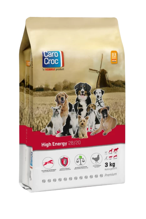 Verwacht je periodiek extreme inspanning en prestaties van je hond en is hij meer dan 3 uur per dag (intensief) in beweging? Denk hierbij aan honden tijdens het jachtseizoen of honden die aan endurance training doen. Voorkom tekorten en voer je hond tijdens deze periode CaroCroc High Energy. Dankzij de uitgebalanceerde samenstelling met hoogwaardige grondstoffen, zoals dierlijke eiwitten, vetten, mineralen en een optimale verhouding omega-3 en -6 vetzuren, biedt CaroCroc High Energy jouw hond datgene wat hij nodig heeft.