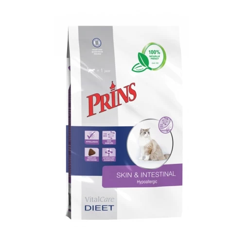 Prins VitalCare dieet Skin & Intestinal Hypoallergic is een volledige dieetvoeding, die langdurig gegeven kan worden. De belangrijkste eigenschappen zijn:
